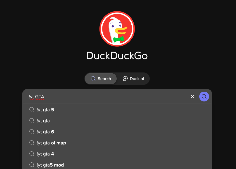 Bangs 是 DDG 推出的一個讓你快速在其他網站(YouTube、Amazon、Wikipedia等)上搜尋關鍵詞的功能。具體使用方法爲:在 DDG 搜尋欄上輸入“!yt GTA”,直接確定就可以了。